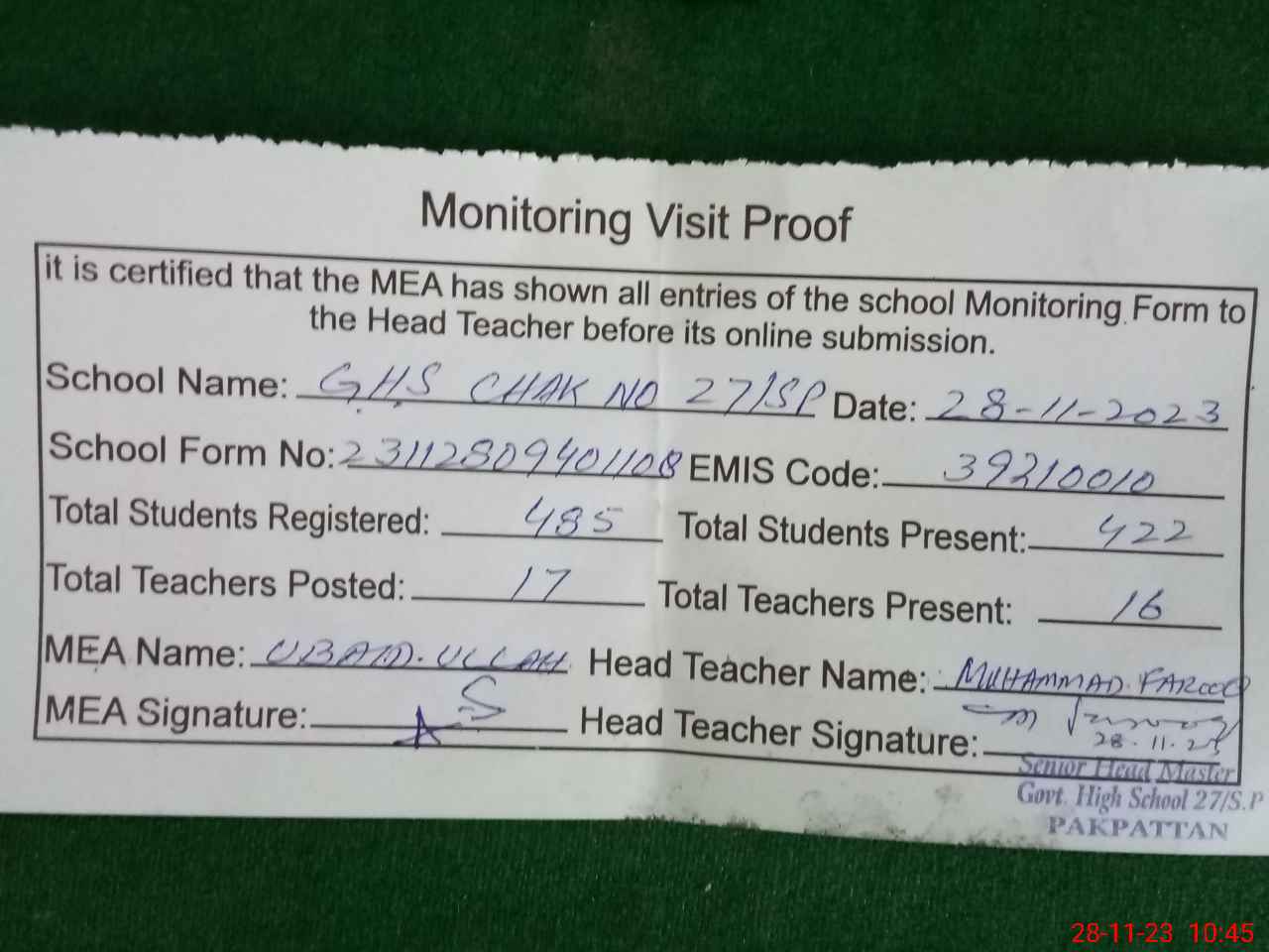 | EMIS Code: 39210010 | Name of School: GHS 27 SP | |||