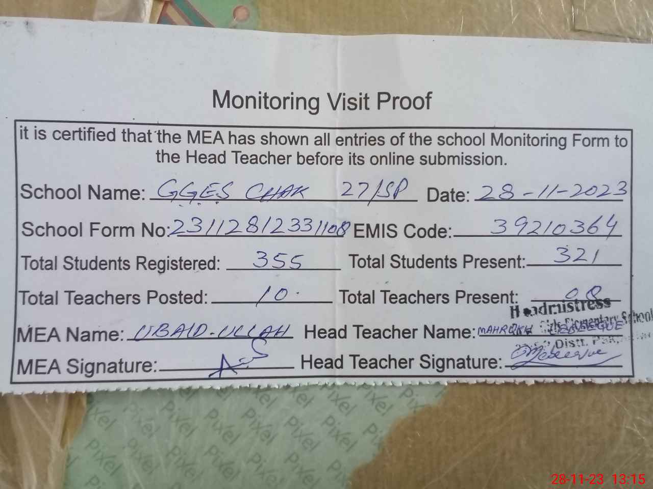 | Attendance Register | Head Teacher | MEA with School | Visit Proof |