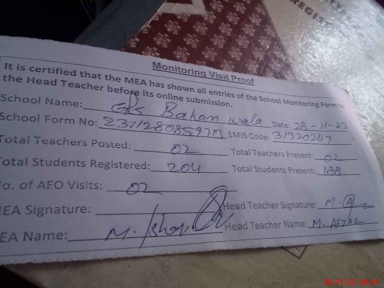 | Attendance Register | Head Teacher | MEA with School | Visit Proof |
