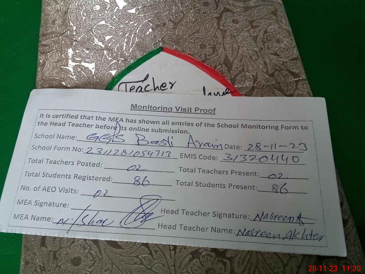 | Attendance Register | Head Teacher | MEA with School | Visit Proof |