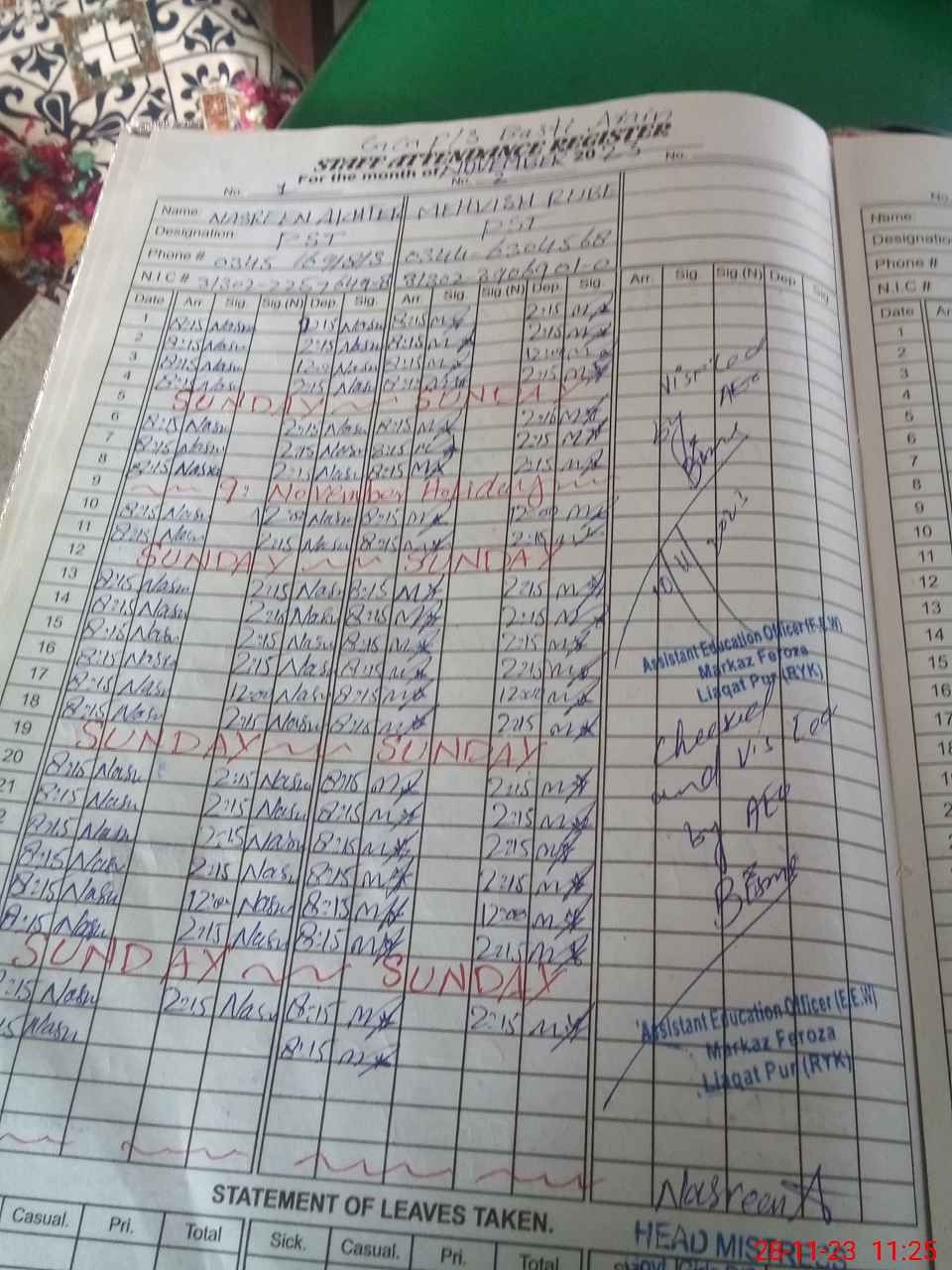| CNIC | Full Name | Designation | R/C | Absence During Last Calender Month |