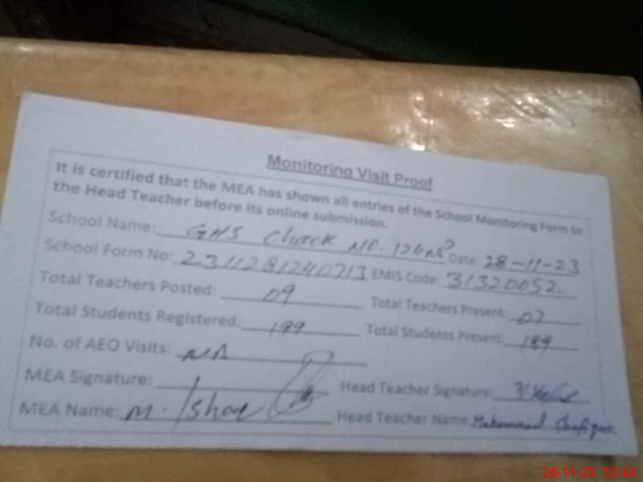 | Attendance Register | Head Teacher | MEA with School | Visit Proof |