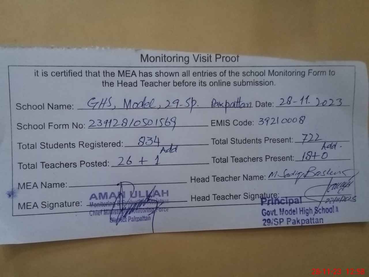 | EMIS Code: 39210008 | Name of School: GHS MODEL 29/SP PAKPATAN | |||
