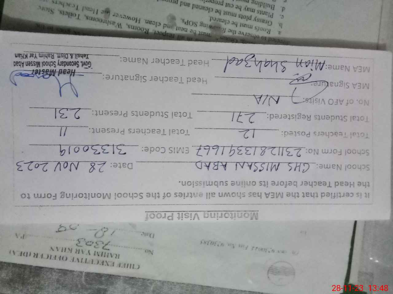 | EMIS Code: 31330019 | Name of School: GHS MISSAN ABAD | |||