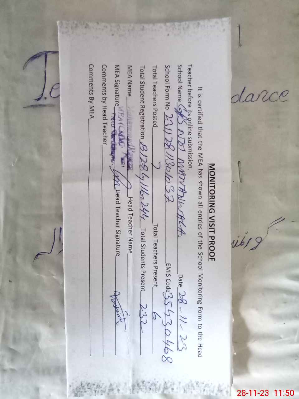 | Attendance Register | Head Teacher | MEA with School | Visit Proof |