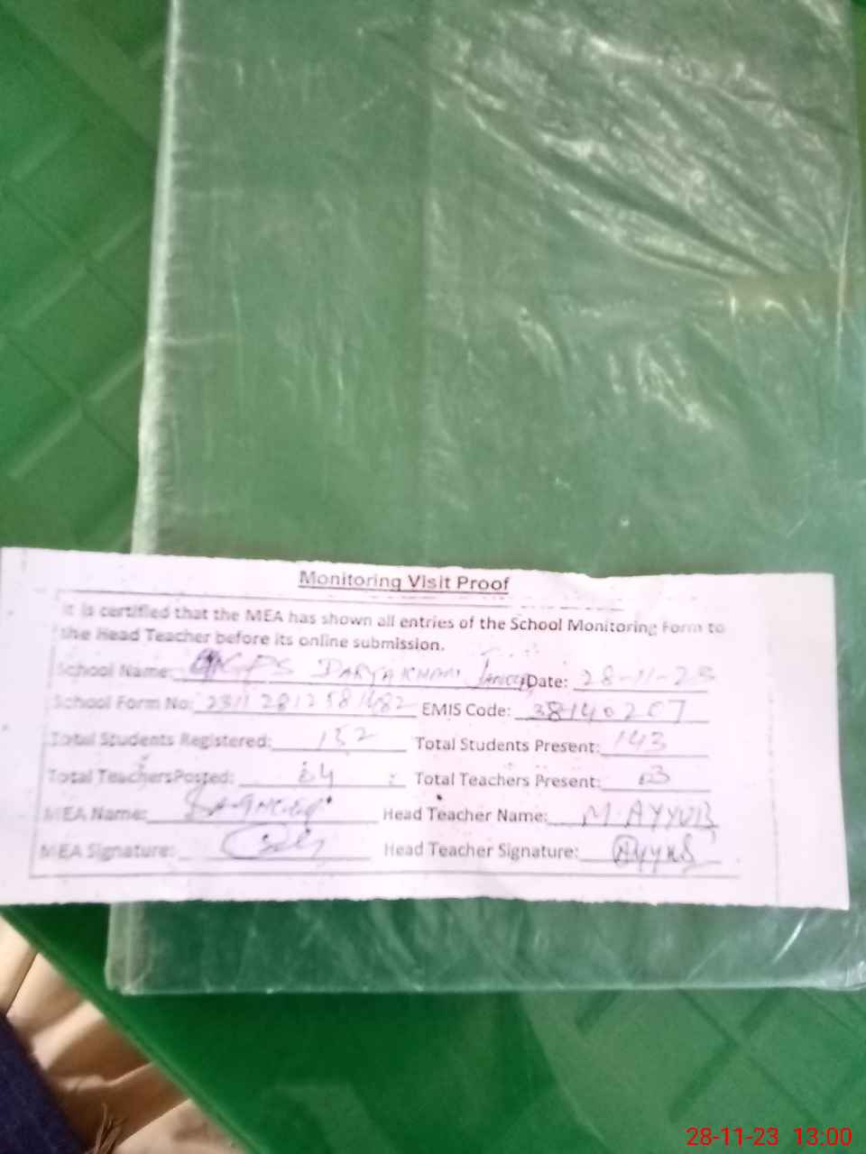 | Attendance Register | Head Teacher | MEA with School | Visit Proof |