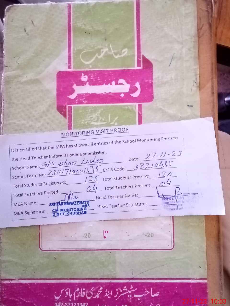 | EMIS Code: 38210435 | Name of School: GPS DHORI LUKOO | |||