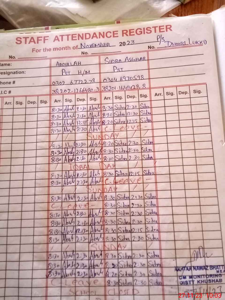 | Name: AB**** Designation: (School Headmaster's/Headmistress's) PST/PTC/JV Phone/Cell Number: 03**** |