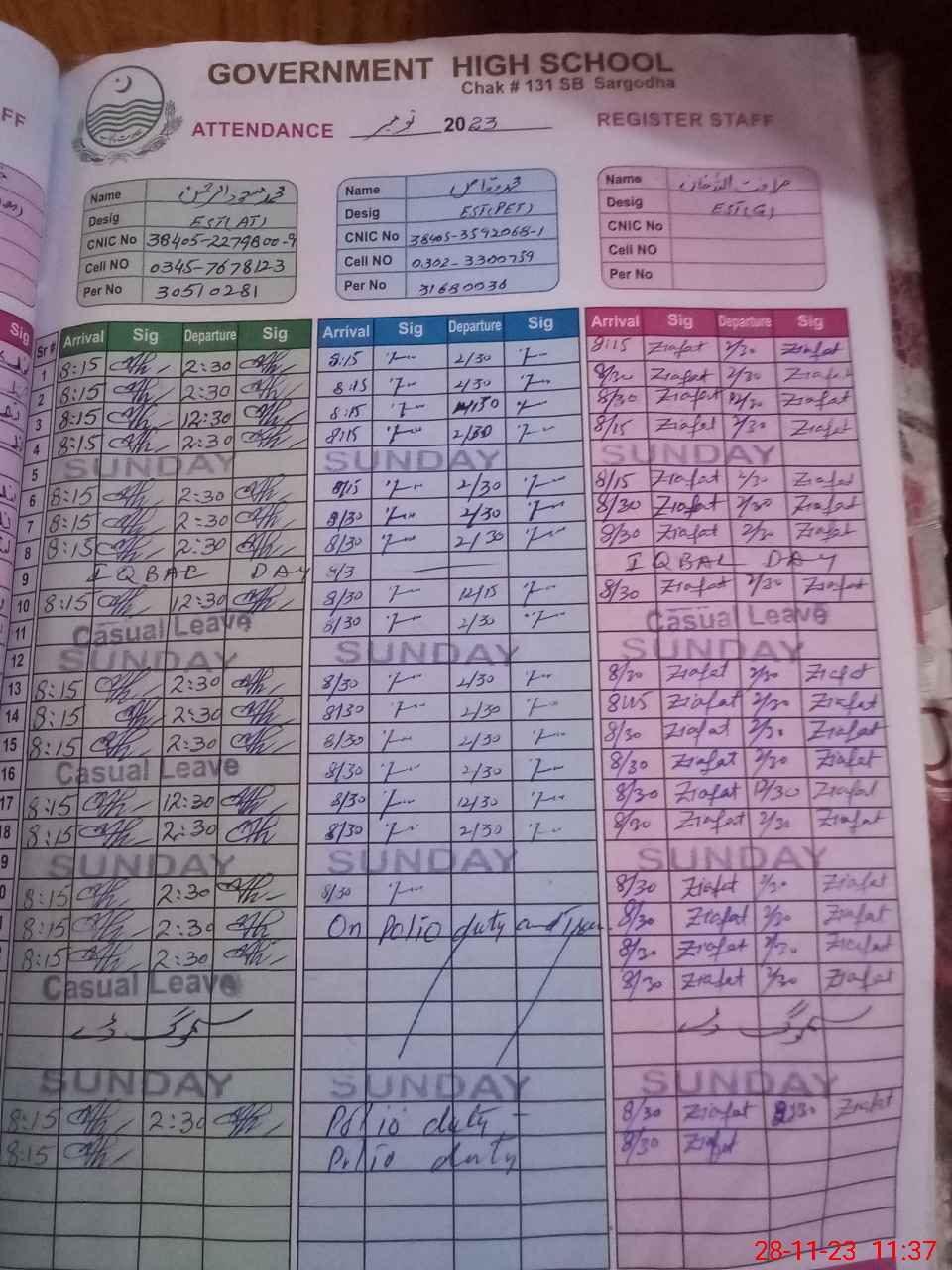 | CNIC | Full Name | Designation | R/C | Absence During Last Calender Month |