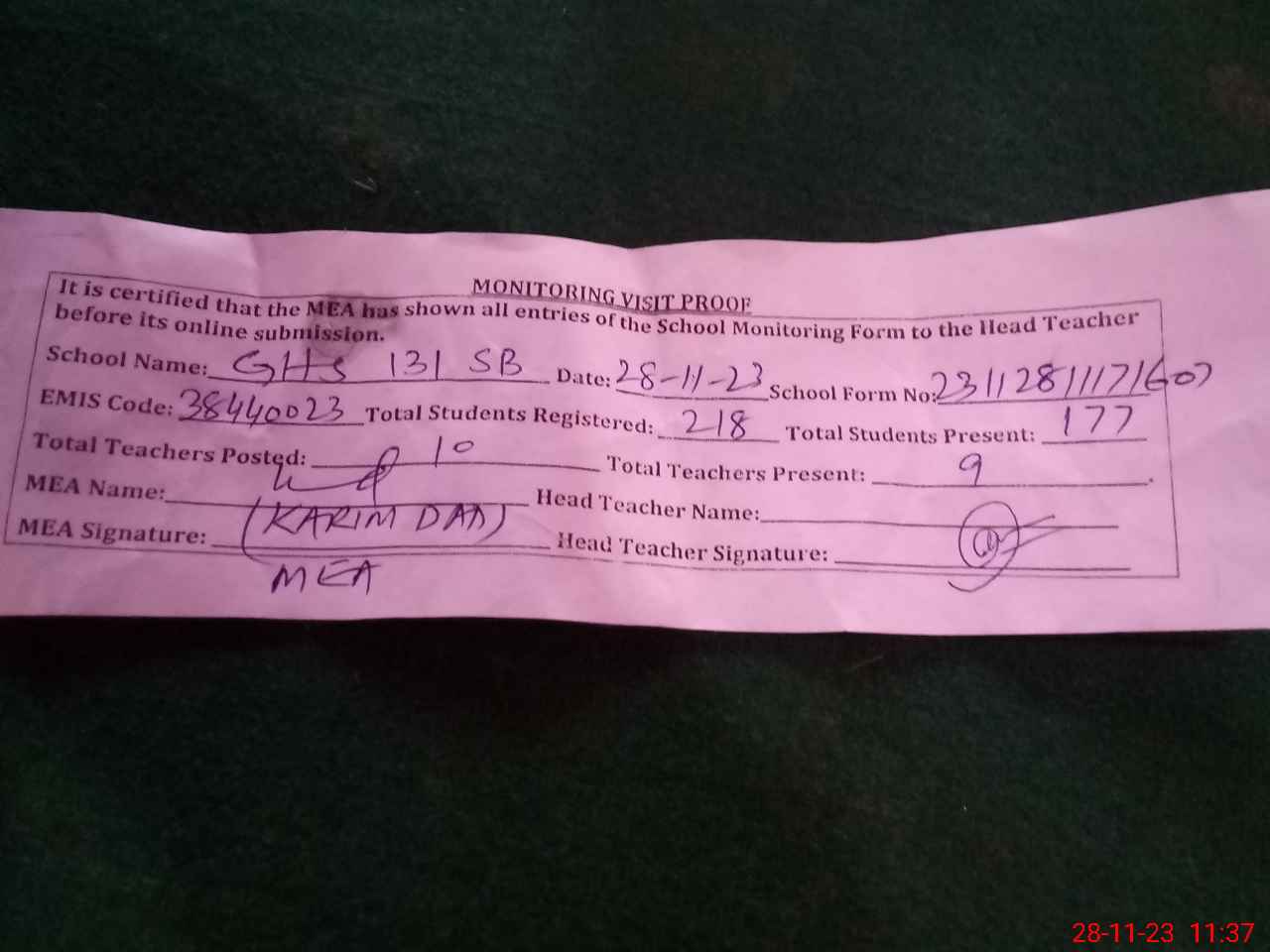 | Attendance Register | Head Teacher | MEA with School | Visit Proof |