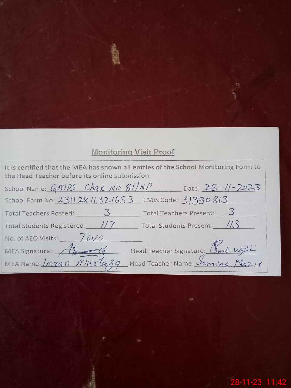 | EMIS Code: 31330813 | Name of School: GMPS CHAK NO. 81/NP | |||