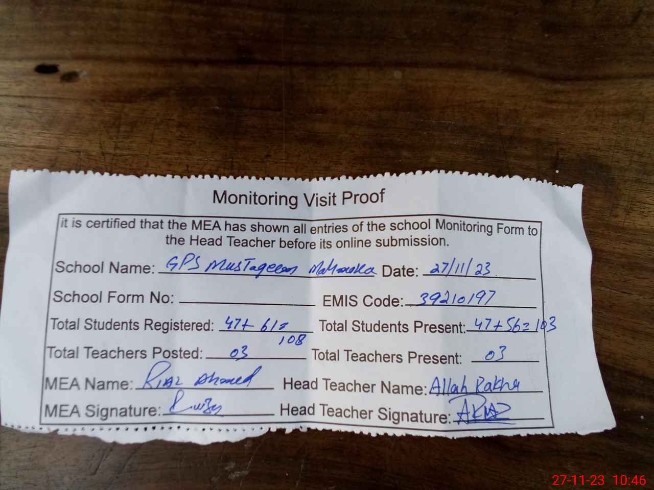 | Attendance Register | Head Teacher | MEA with School | Visit Proof |