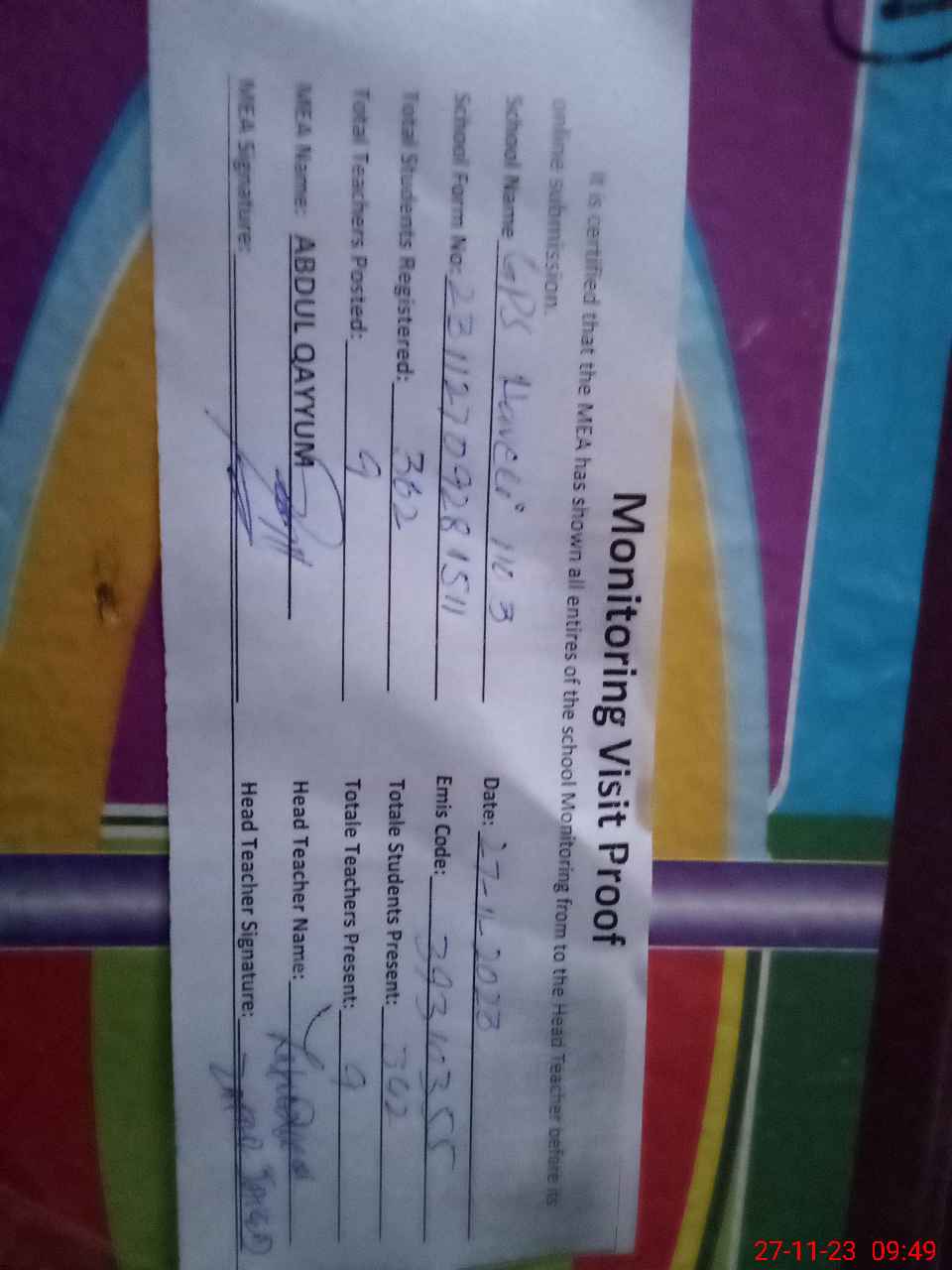 | Attendance Register | Head Teacher | MEA with School | Visit Proof |