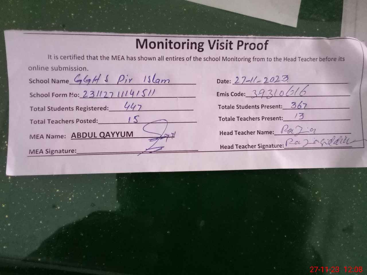 | Attendance Register | Head Teacher | MEA with School | Visit Proof |
