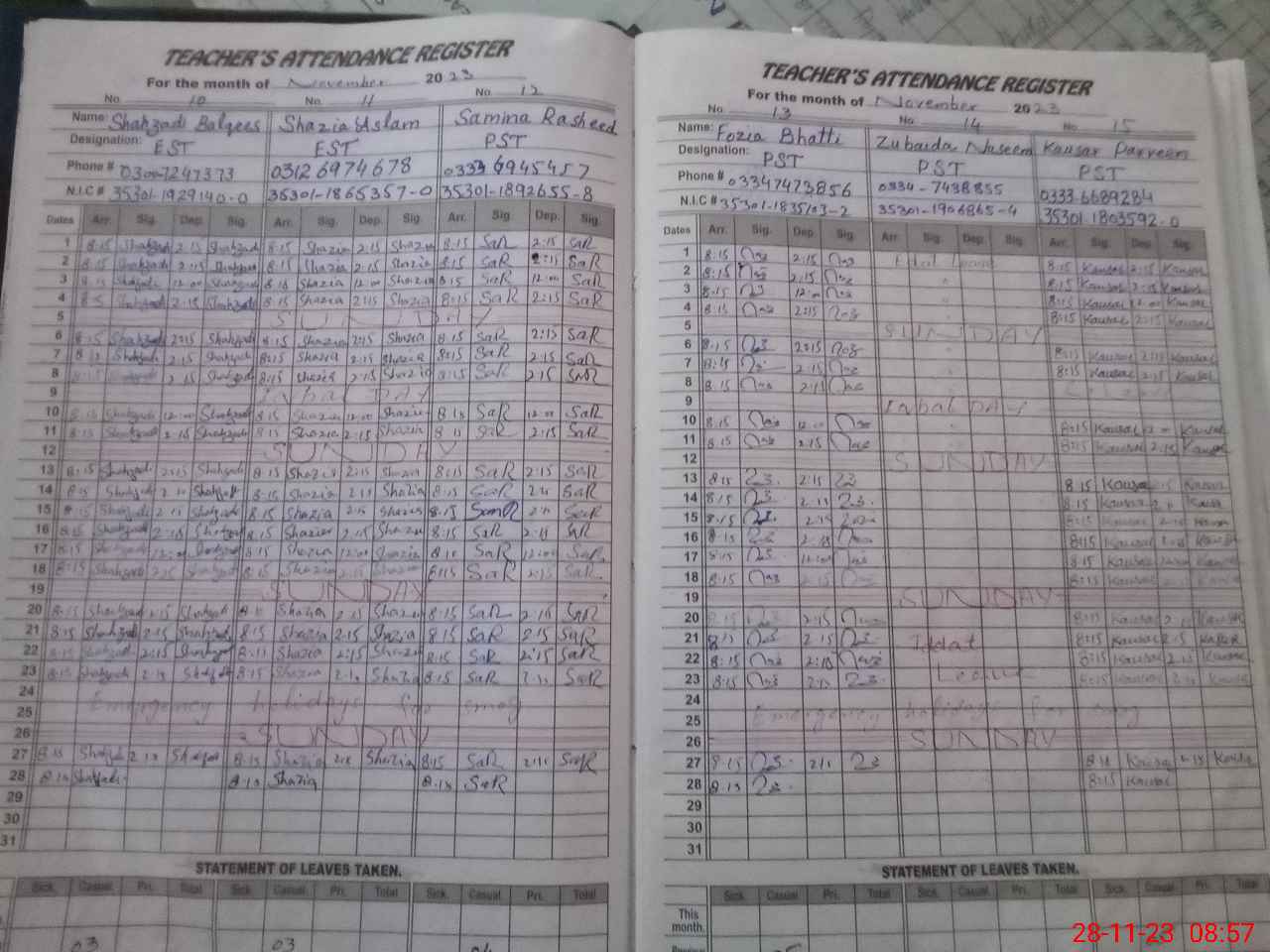 | CNIC | Full Name | Designation | R/C | Absence During Last Calender Month |