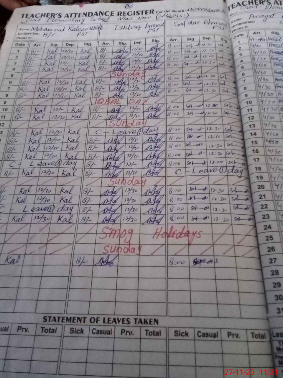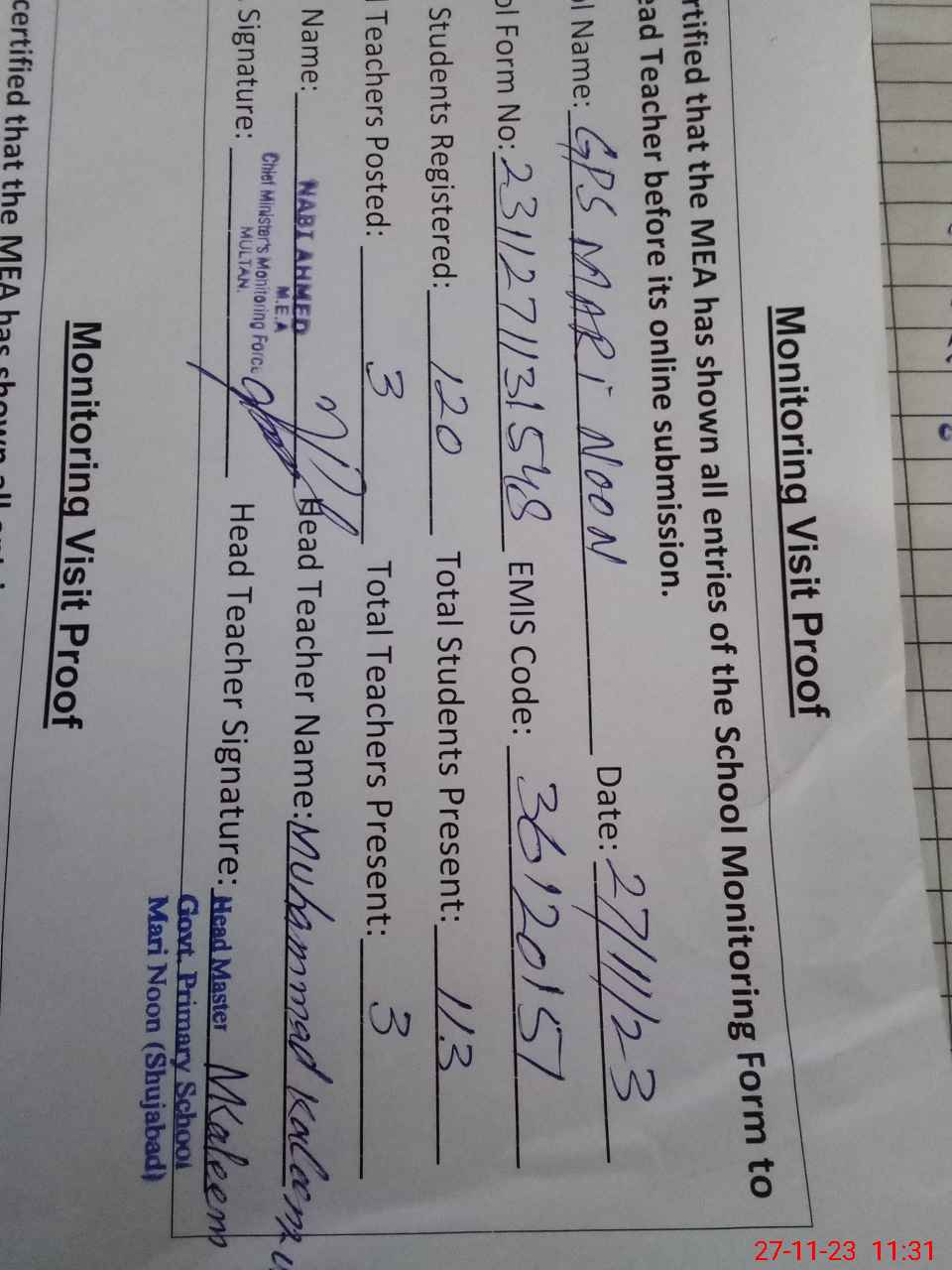 | Attendance Register | Head Teacher | MEA with School | Visit Proof |