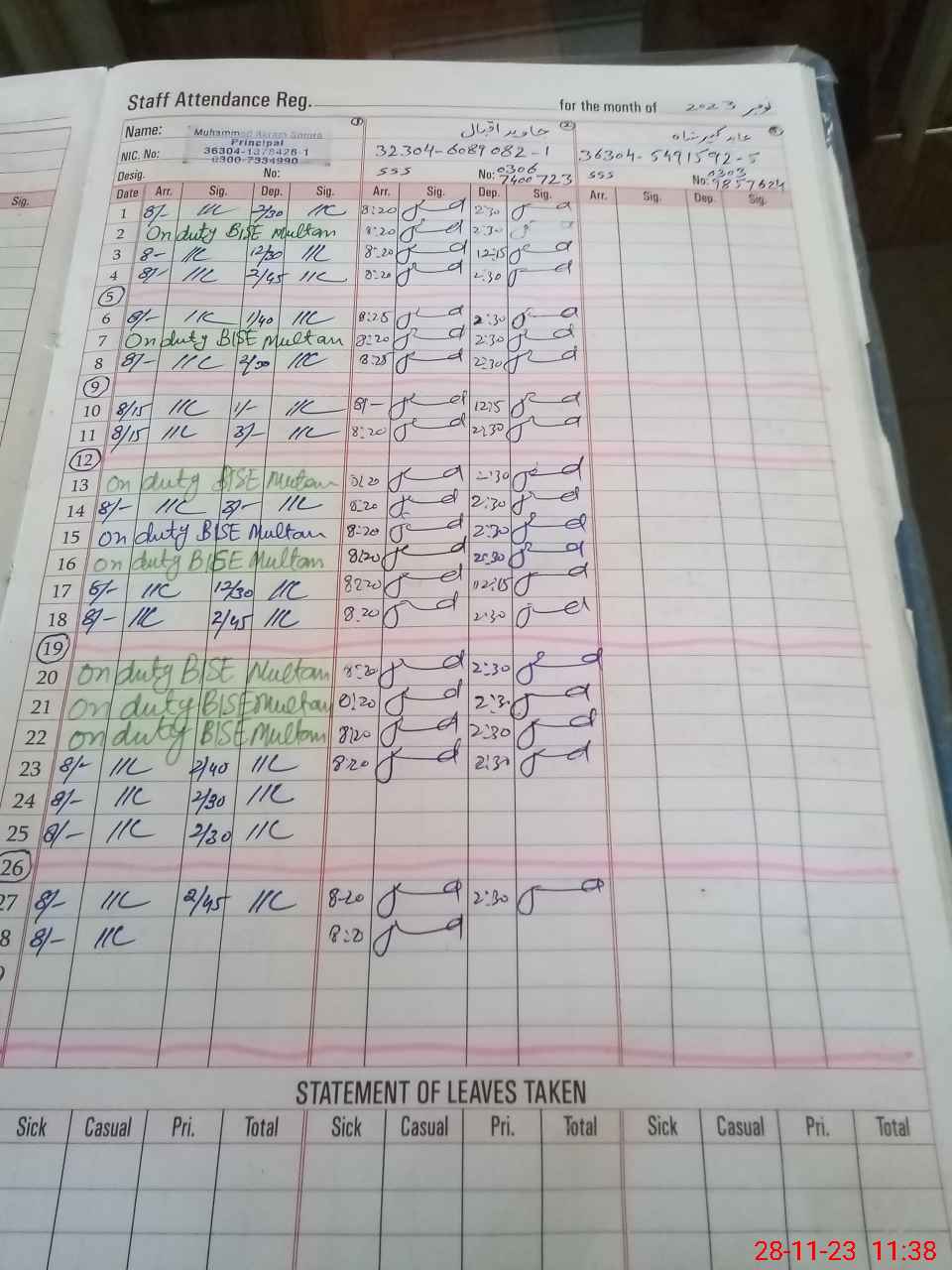 | CNIC | Full Name | Designation | R/C | Absence during last cal. month |
