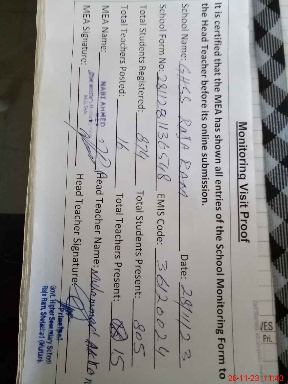 | Attendance Register | Head Teacher | MEA with School | Visit Proof |