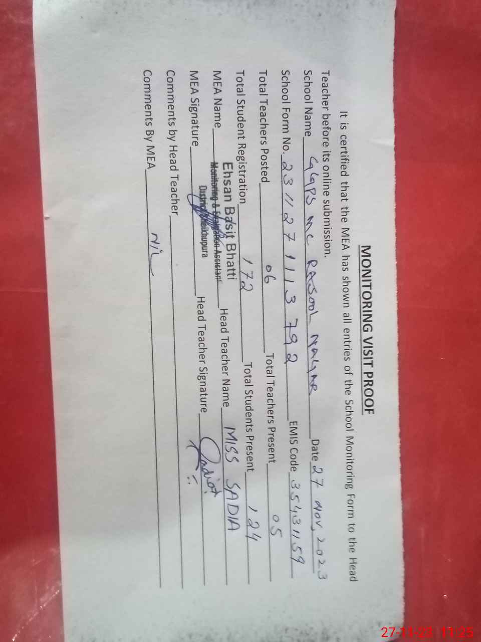 | EMIS Code: 35431159 | Name of School: GGPS MC RASOOL NAGAR | |||