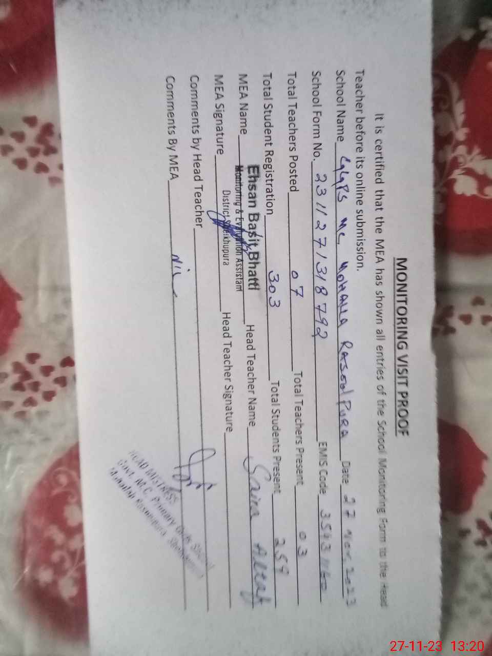 | EMIS Code: 35431160 | Name of School: GGPS MC MOHALLA RASOOL PURA | |||