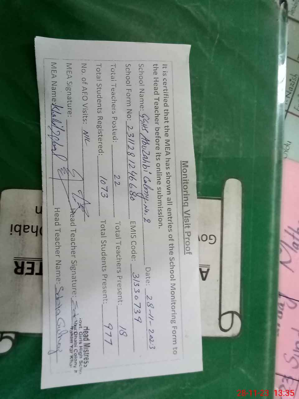 | EMIS Code: 31330739 | Name of School: GGHS ABU ZAHBI COLONY NO.2 | |||