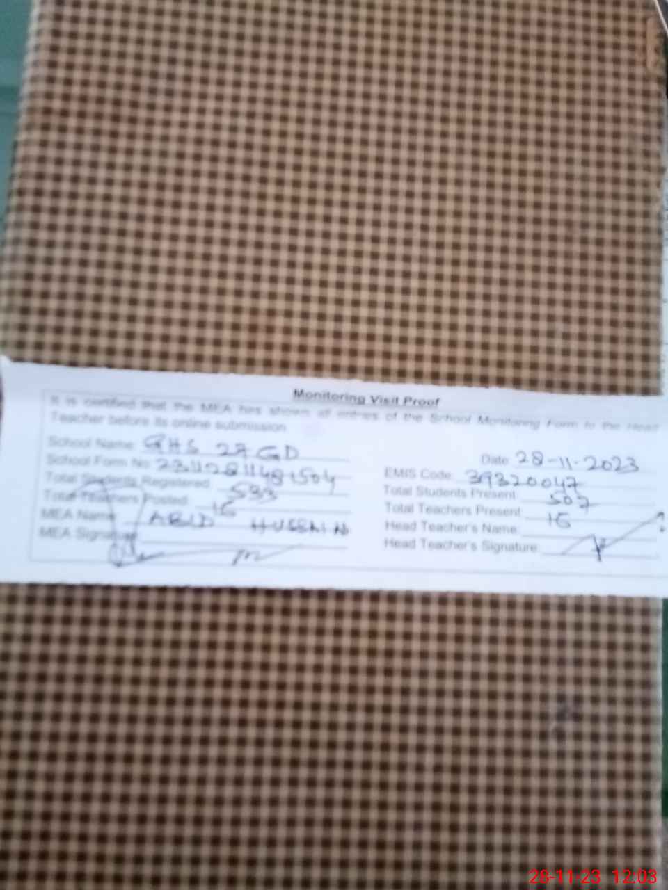 | Attendance Register | Head Teacher | MEA with School | Visit Proof |