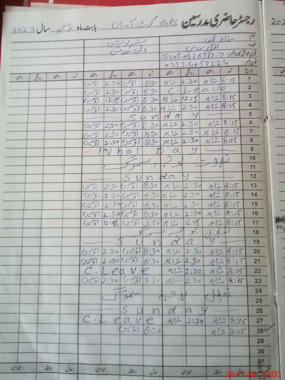 | CNIC | Full Name | Designation | R/C | Absence During Last Calender Month |