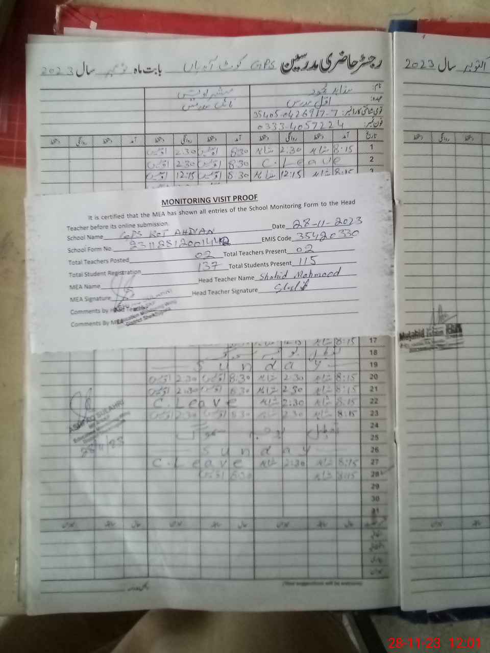 | Attendance Register | Head Teacher | MEA with School | Visit Proof |