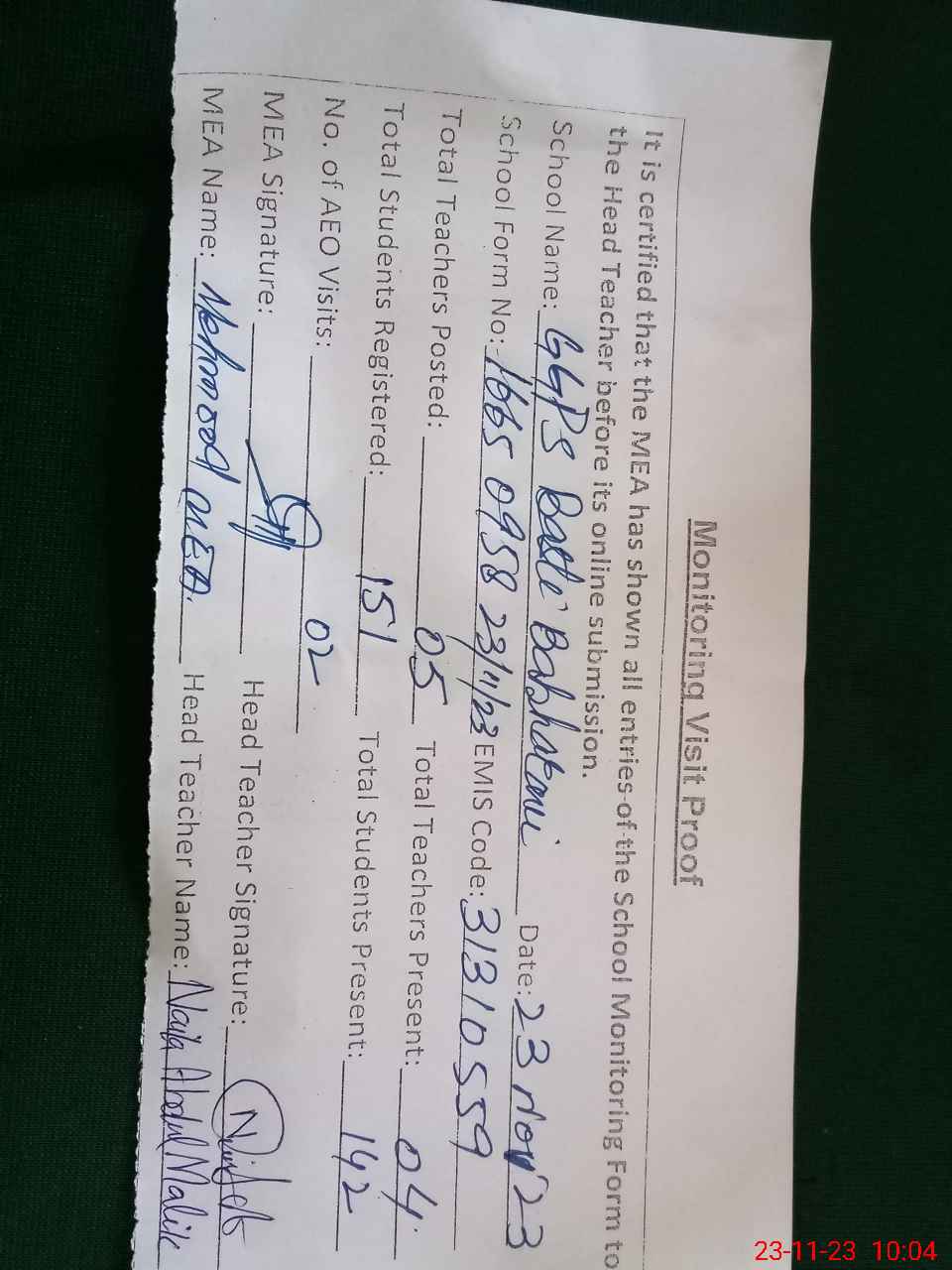 | Monitoring Date: 23-11-2023 | Start Time: 23-11-2023 09:42 AM | End Time: 23-11-2023 10:04 AM | Name of MEA: Ma**** UlHa**** | |