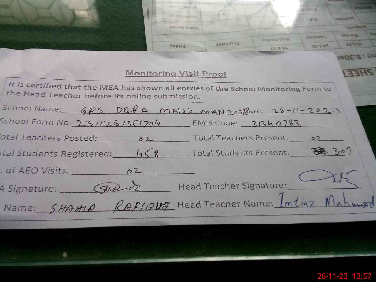 | Attendance Register | Head Teacher | MEA with School | Visit Proof |