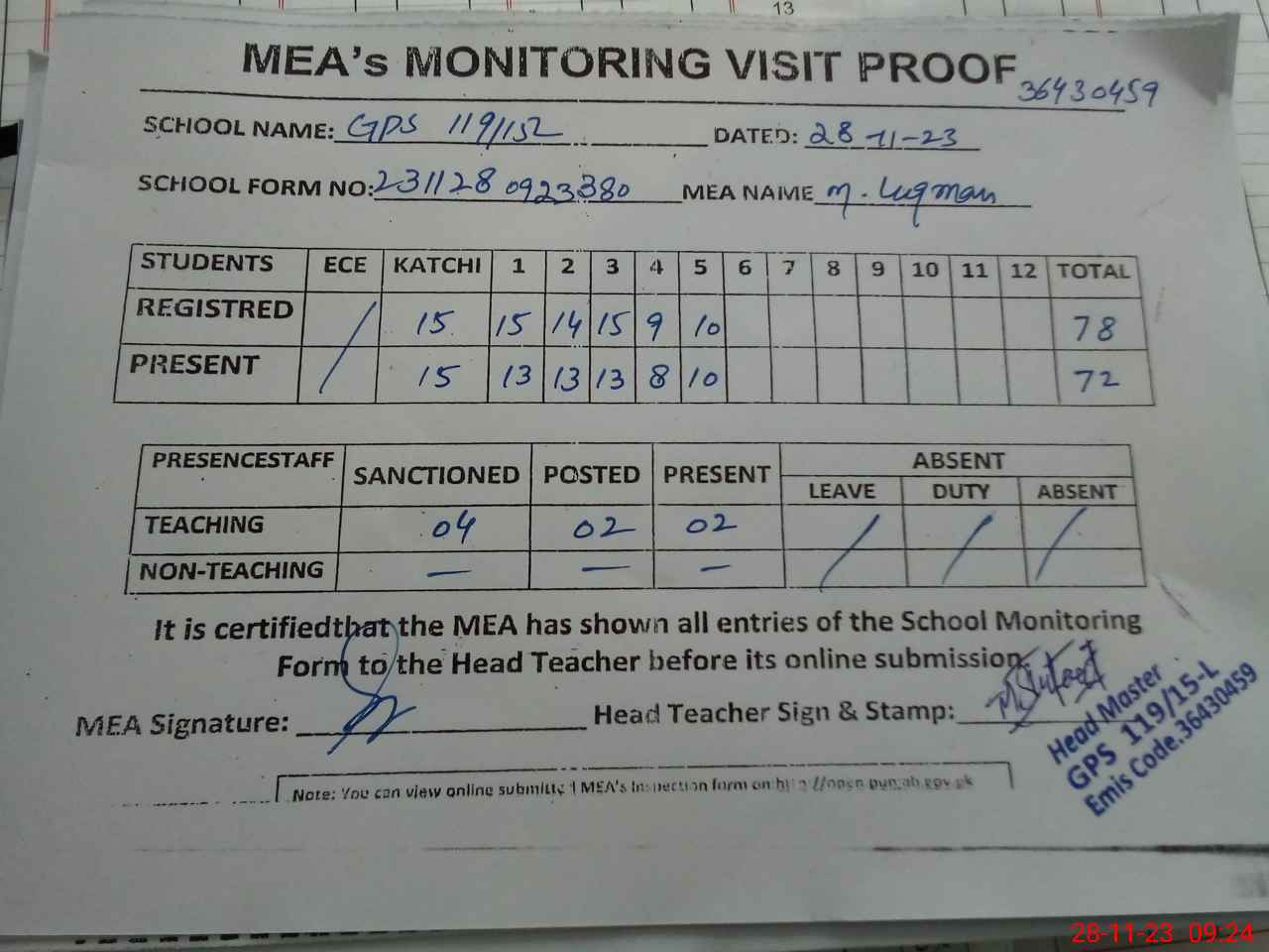 | Attendance Register | Head Teacher | MEA with School | Visit Proof |