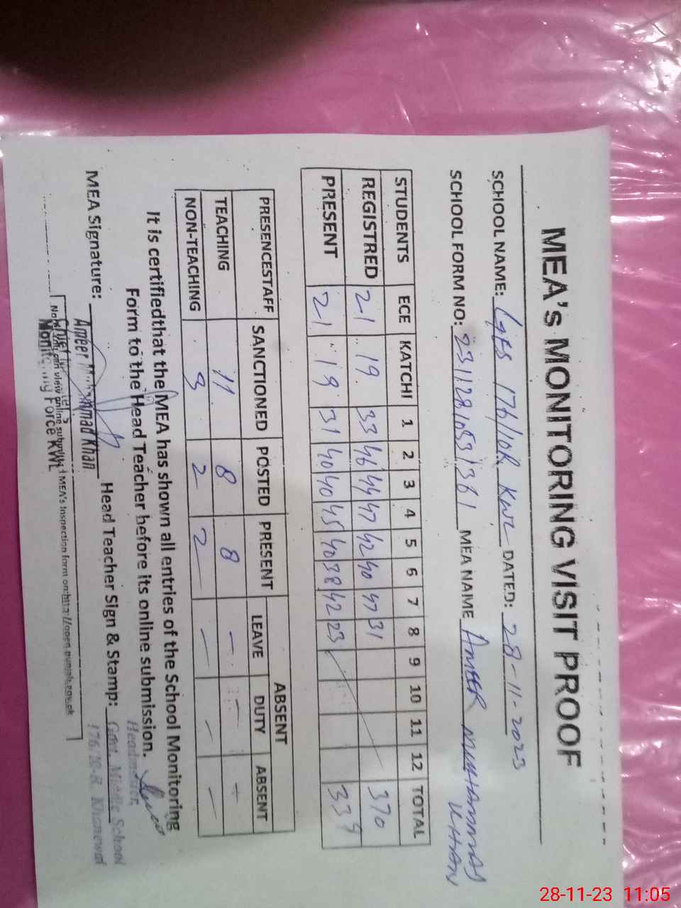 | Attendance Register | Head Teacher | MEA with School | Visit Proof |