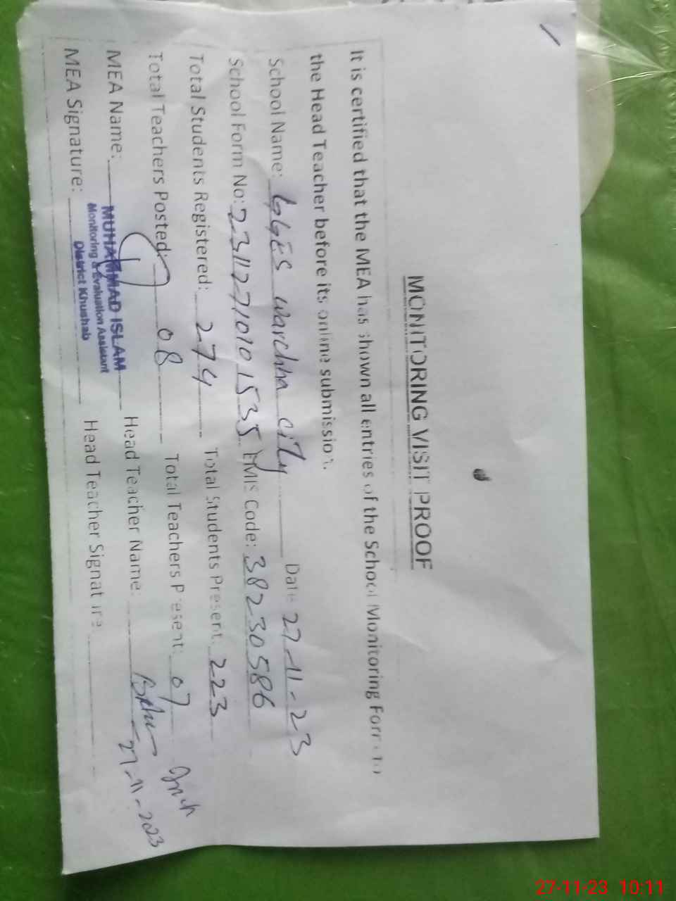 | Attendance Register | Head Teacher | MEA with School | Visit Proof |