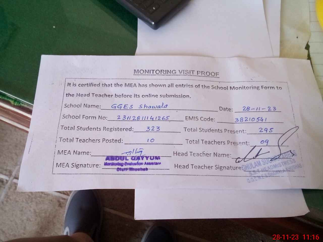 | Attendance Register | Head Teacher | MEA with School | Visit Proof |