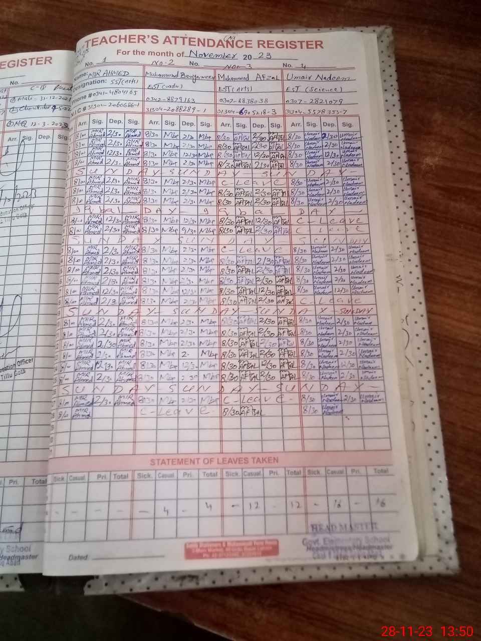 | CNIC | Full Name | Designation | R/C | Absence During Last Calender Month |