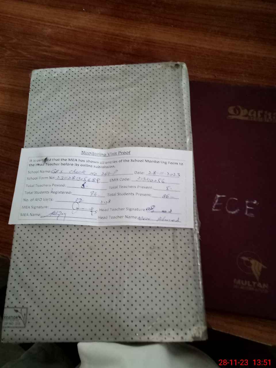 | Attendance Register | Head Teacher | MEA with School | Visit Proof |