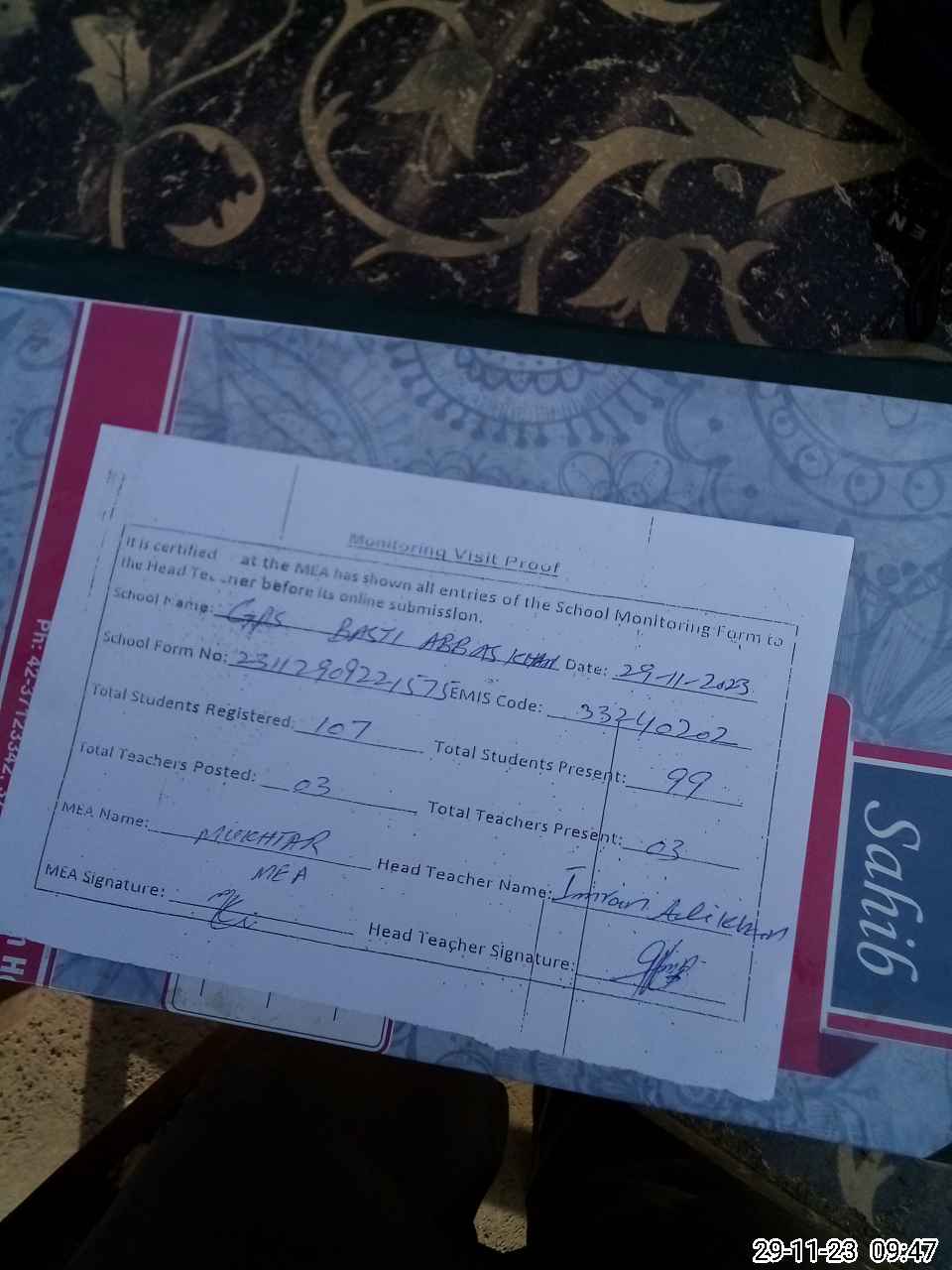 | Attendance Register | Head Teacher | MEA with School | Visit Proof |