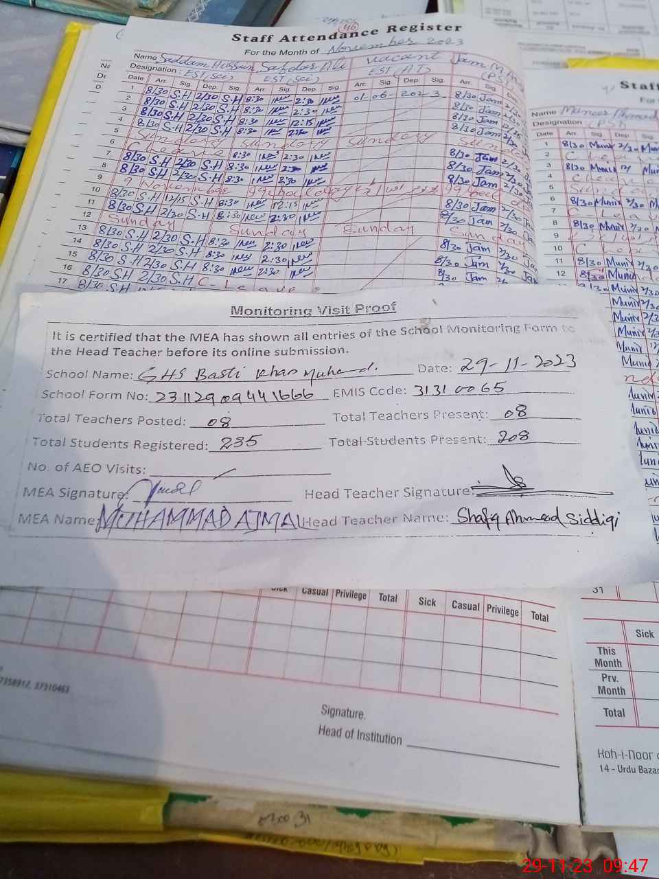 | Attendance Register | Head Teacher | MEA with School | Visit Proof |