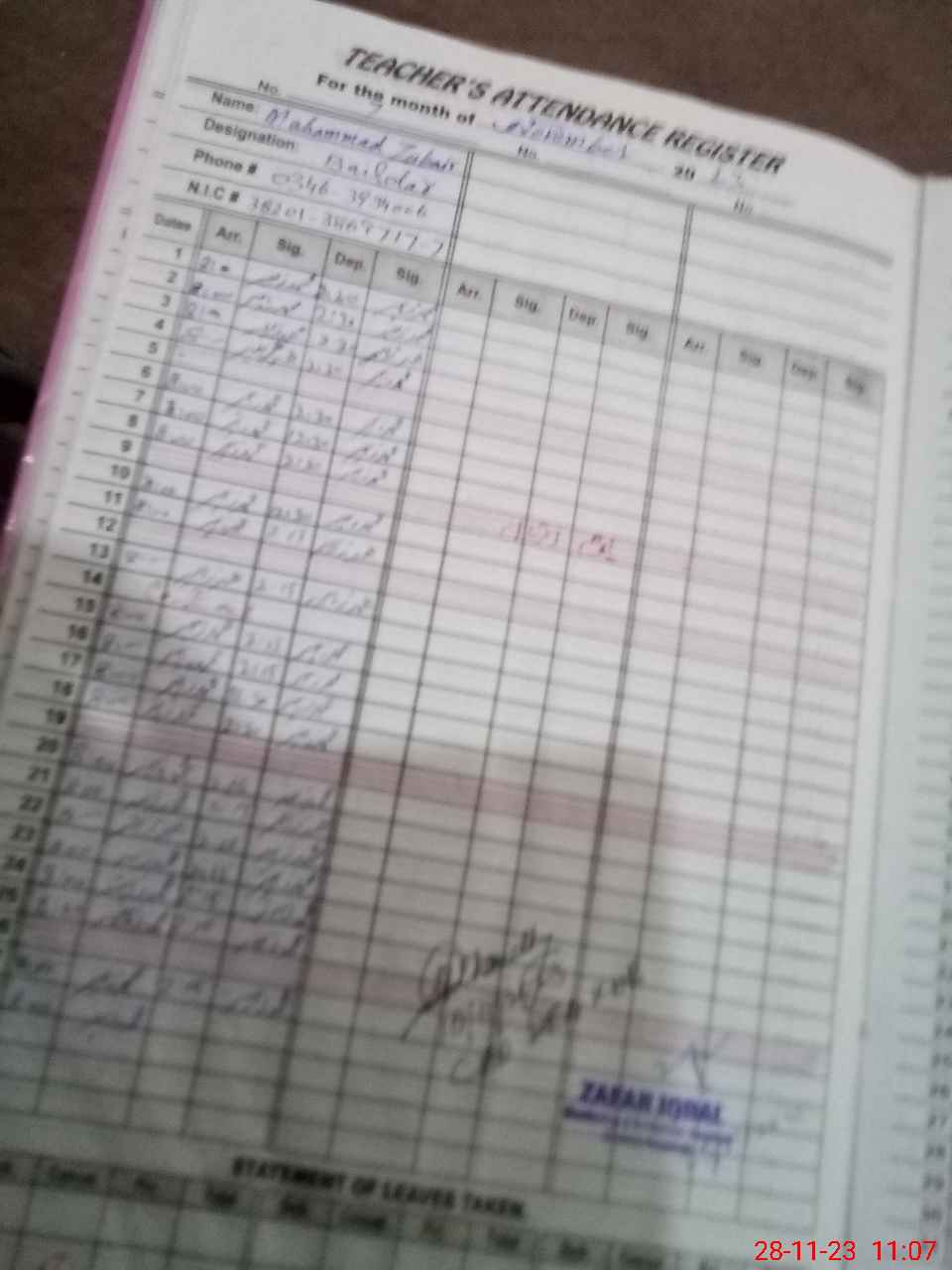 | CNIC | Full Name | Designation | R/C | Absence During Last Calender Month |