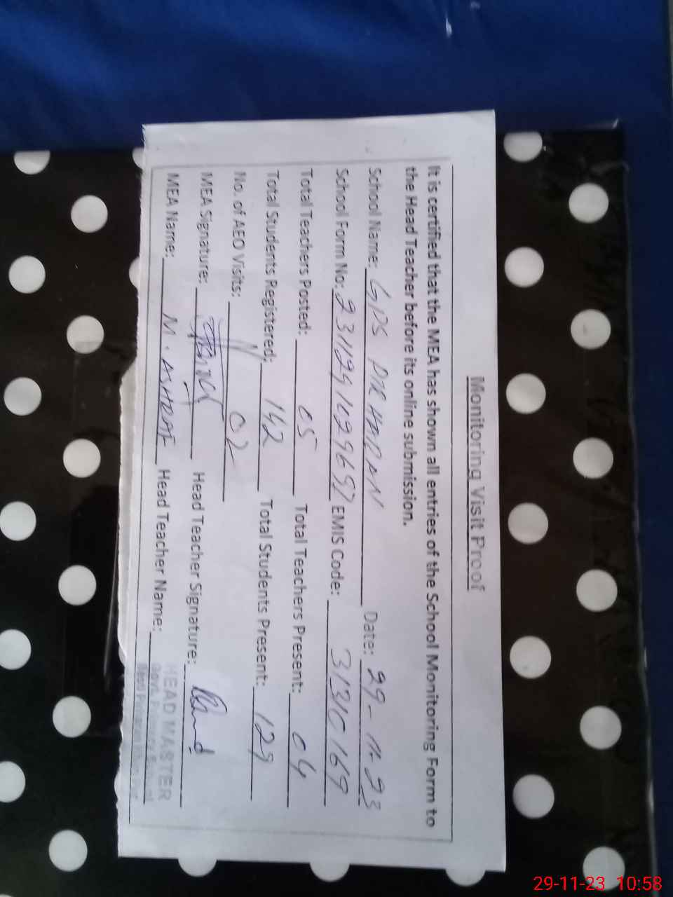 | Attendance Register | Head Teacher | MEA with School | Visit Proof |