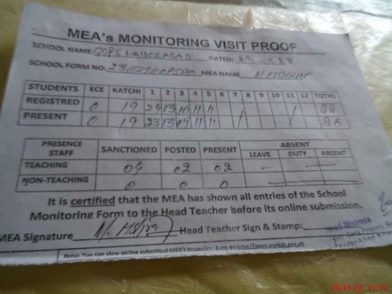 | Attendance Register | Head Teacher | MEA with School | Visit Proof |