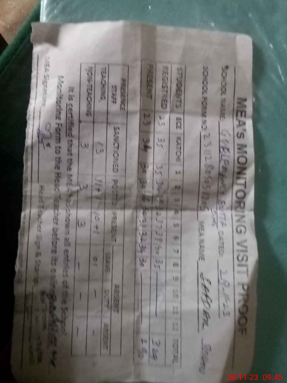 | Attendance Register | Head Teacher | MEA with School | Visit Proof |