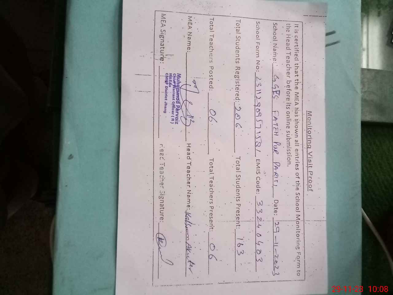 | Attendance Register | Head Teacher | MEA with School | Visit Proof |