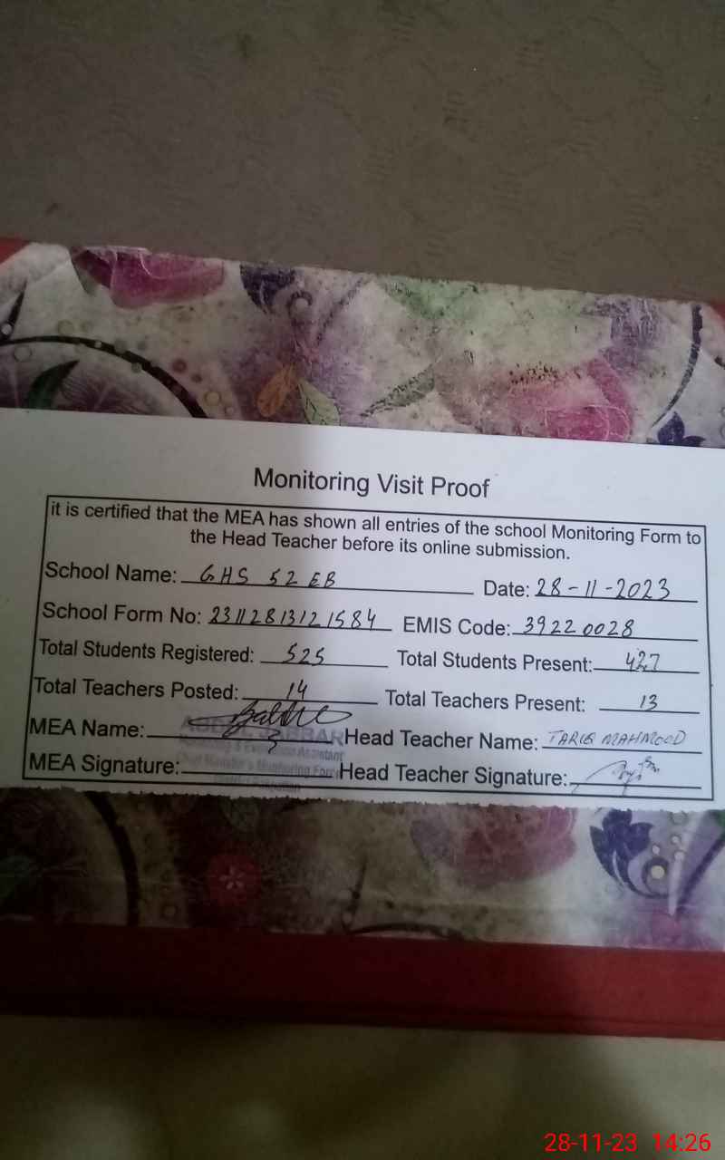 | EMIS Code: 39220028 | Name of School: GHS 52 EB | |||