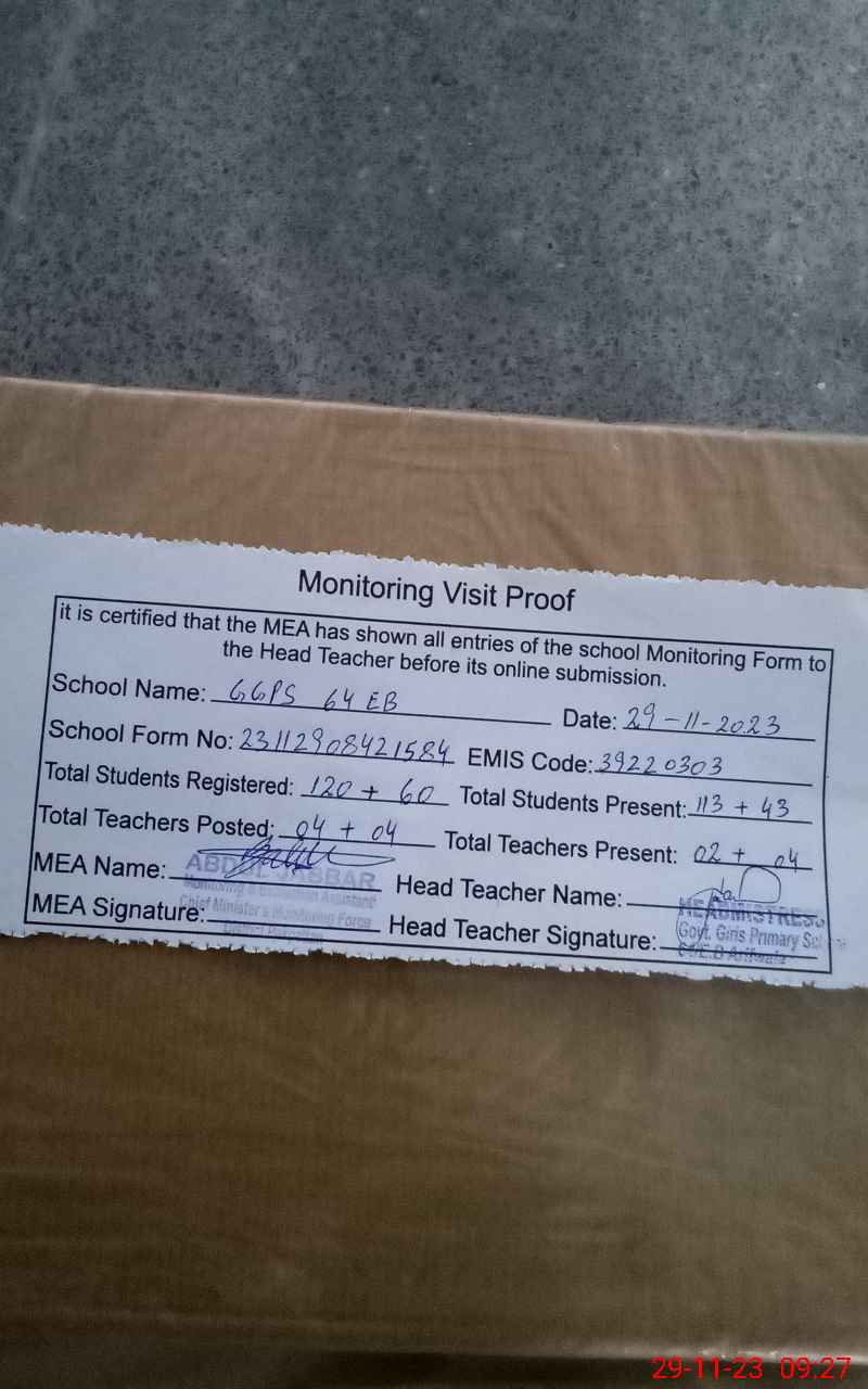 | EMIS Code: 39220303 | Name of School: GGPS 64/EB ARIFWALA | |||