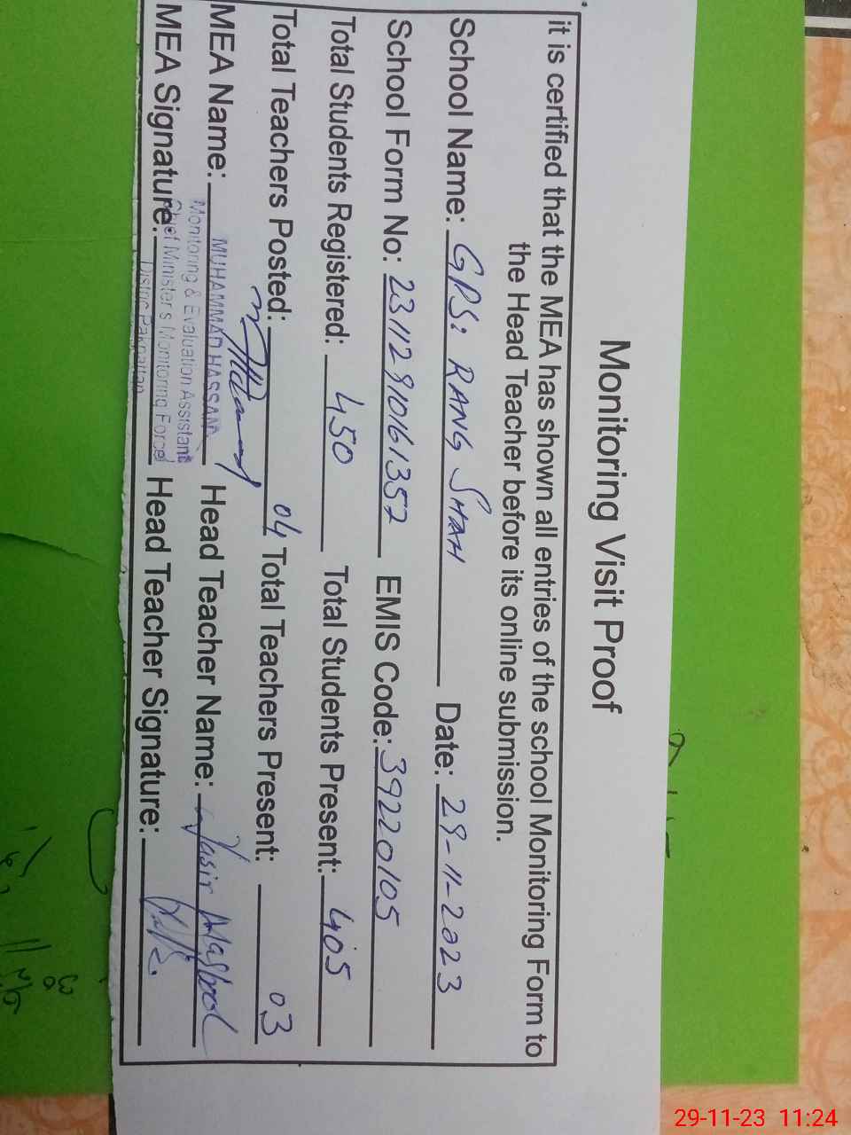 | EMIS Code: 39220105 | Name of School: GPS RANG SHAH | |||