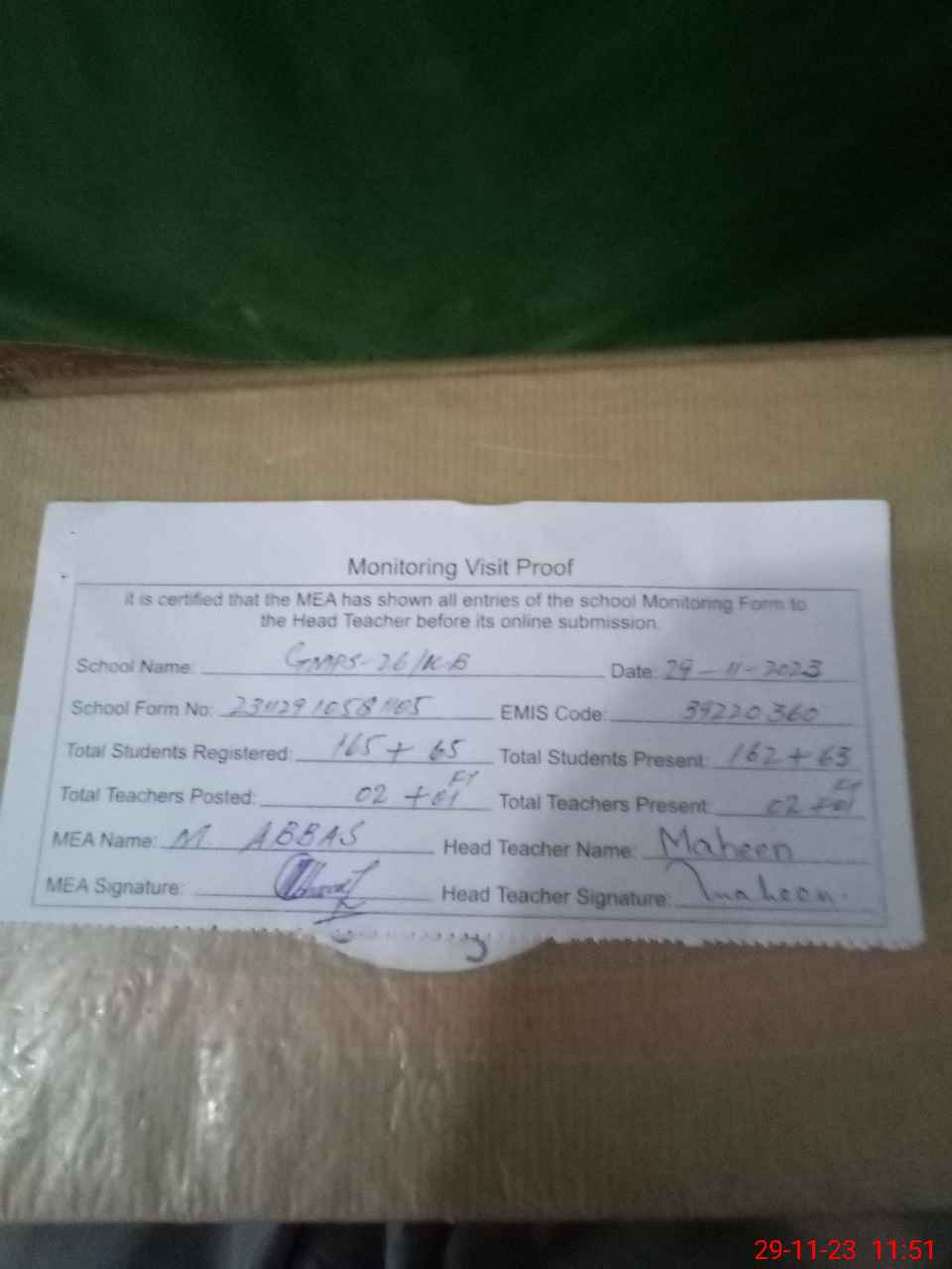 | Attendance Register | Head Teacher | MEA with School | Visit Proof |