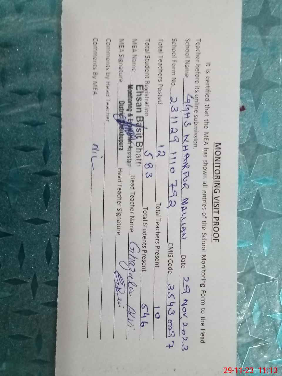 | Attendance Register | Head Teacher | MEA with School | Visit Proof |