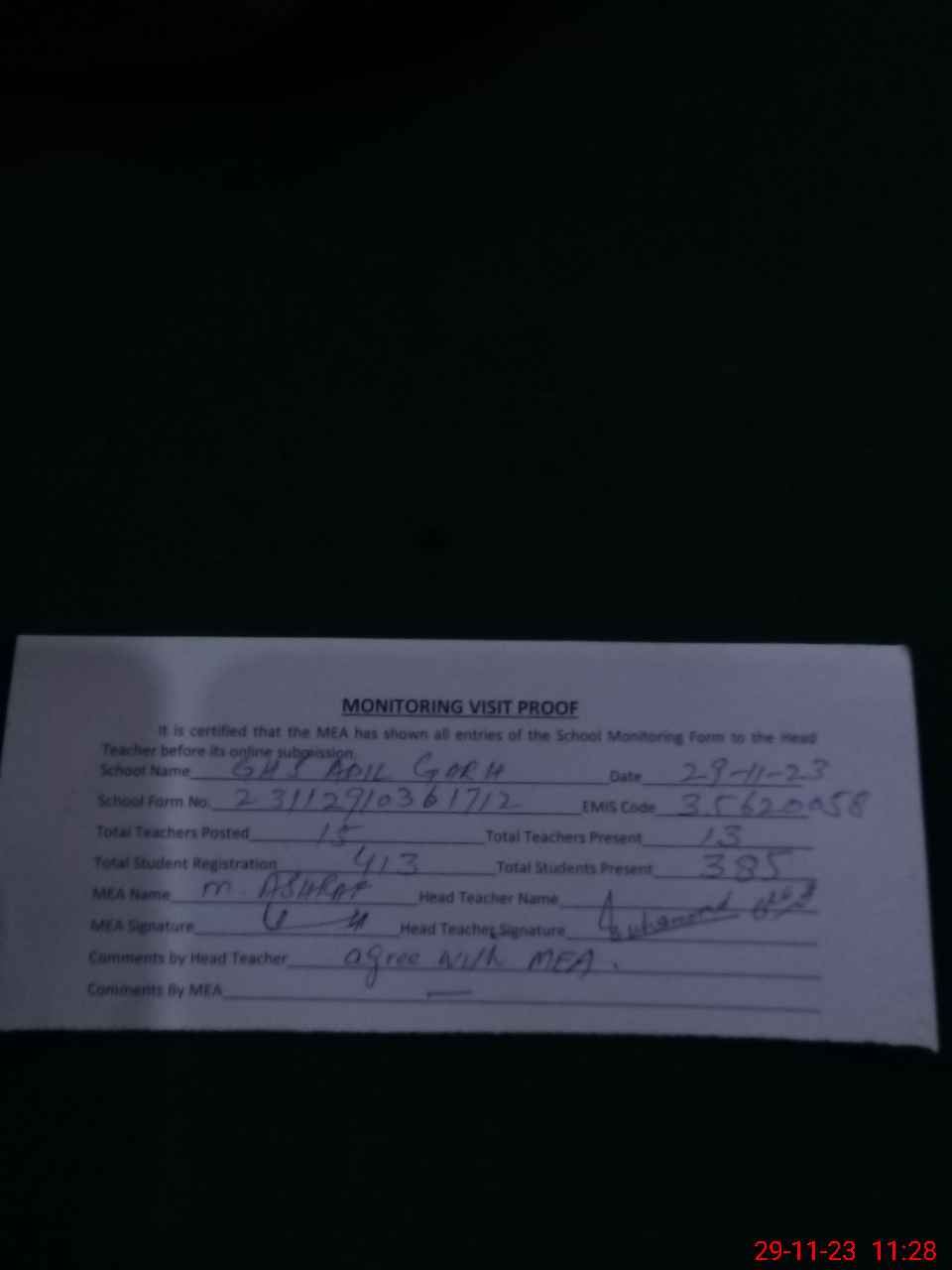 | Attendance Register | Head Teacher | MEA with School | Visit Proof |