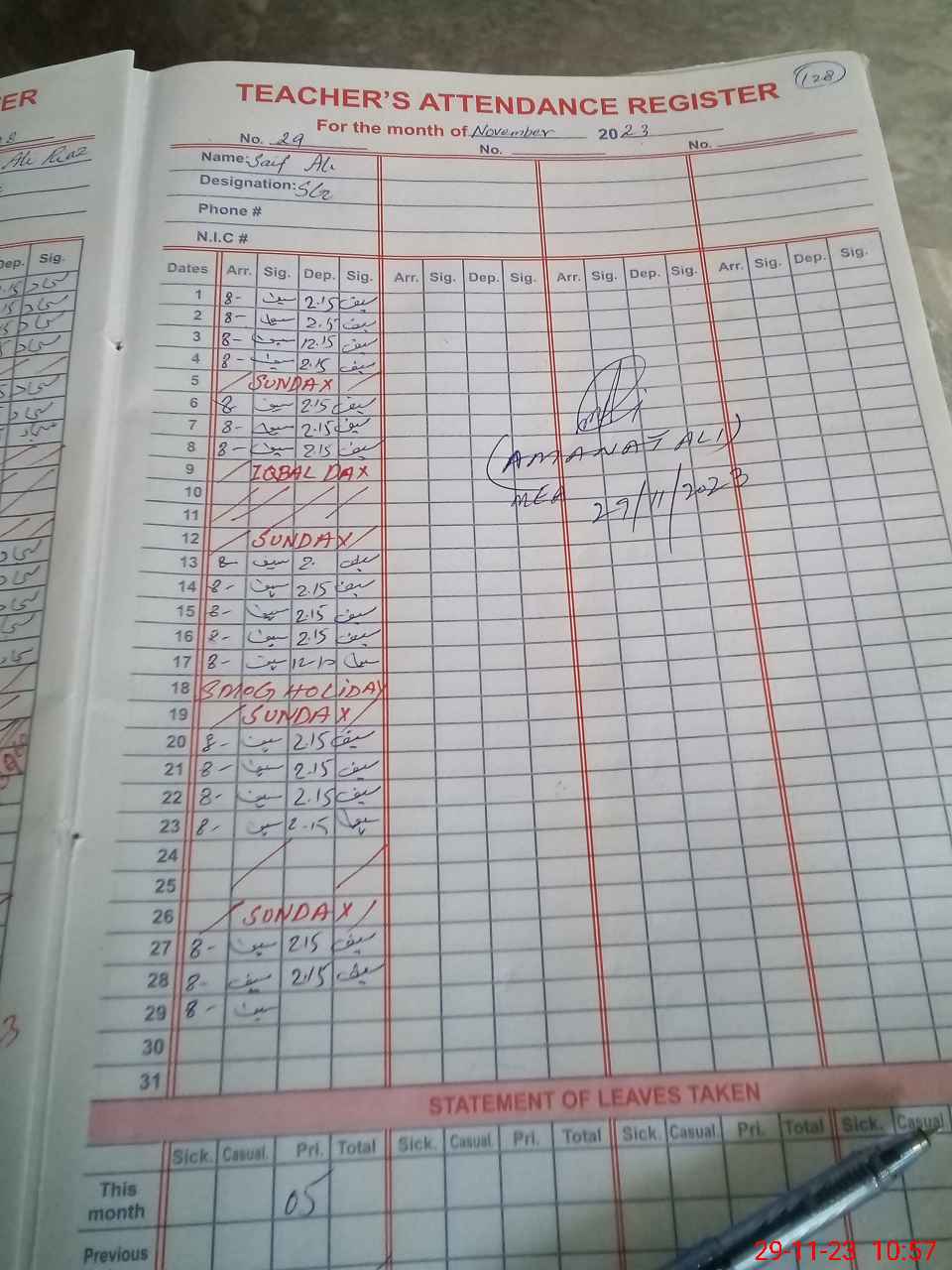 | CNIC | Full Name | Designation | R/C | Absence During Last Calender Month |